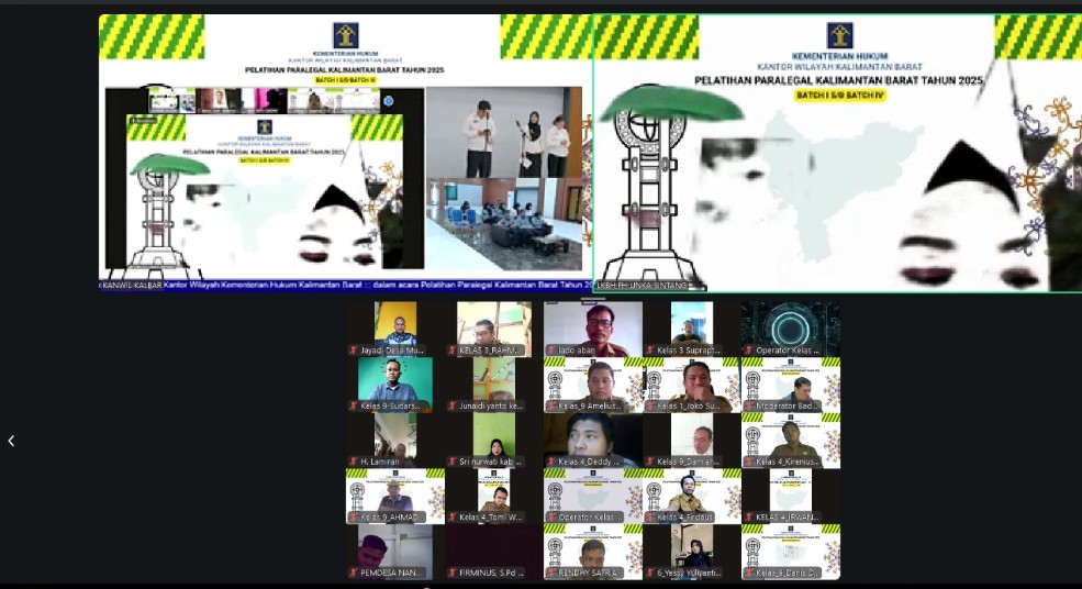 Pontianak – Kantor Wilayah Kementerian Hukum Kalimantan Barat menggelar Pelatihan Paralegal Kalimantan Barat Tahun 2025 Batch III dan Batch IV secara virtual melalui Zoom Meeting. Kegiatan pembukaan berlangsung di Aula Soepomo dan diikuti ratusan peserta dari berbagai kabupaten, Senin (24/11).